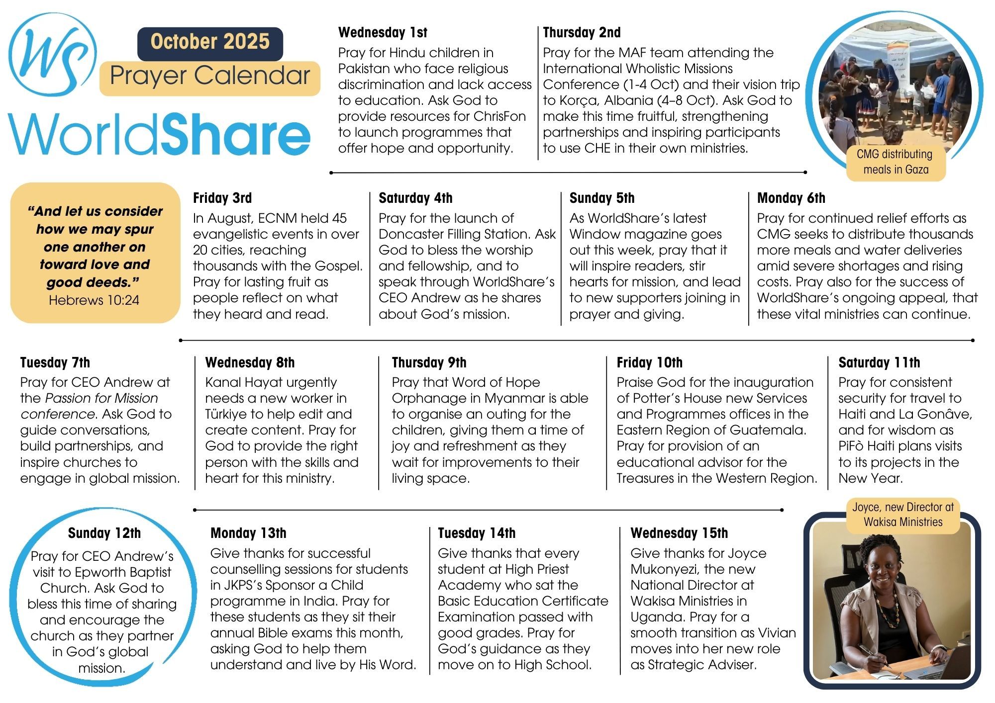 Prayer is the foundation of all we do here at WorldShare. Without it we are undertaking endeavours in our own strength. As we pray, we seek to follow what the Lord desires and to let Him fulfil His purposes, not ours. As we call on the Holy Spirit, we see Him do far more than we could ever imagine. Thank you for joining us in this vital area of our ministry.