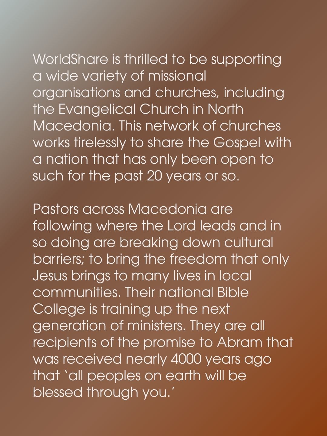 Pastors across Macedonia are following where the Lord leads and in so doing are breaking down cultural barriers; to bring the freedom that only Jesus brings to many lives in local communities. Their national Bible College is training up the next generation of ministers. They are all recipients of the promise to Abram that was received nearly 4000 years ago that ‘all peoples on earth will be blessed through you.’