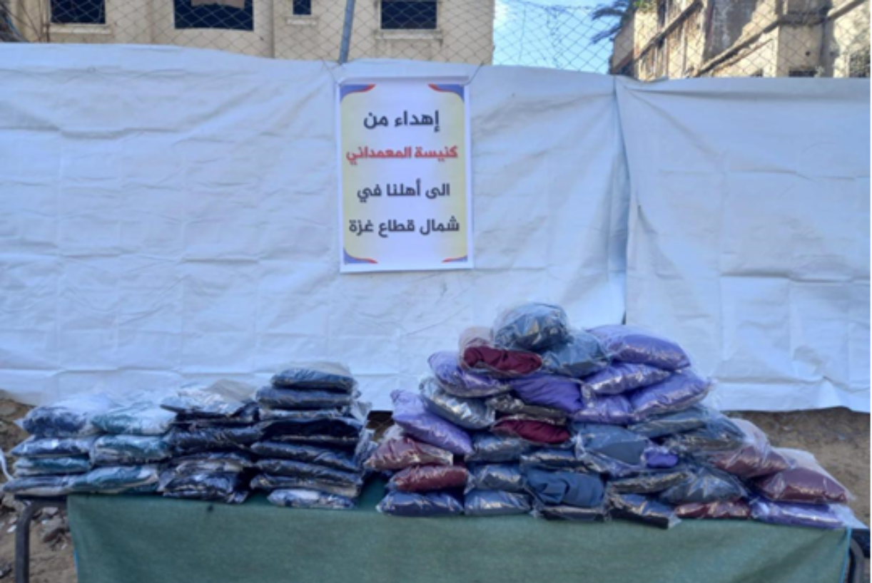 The sign reads: "A gift from Gaza Baptist Church. To our people in the northern Gaza Strip."